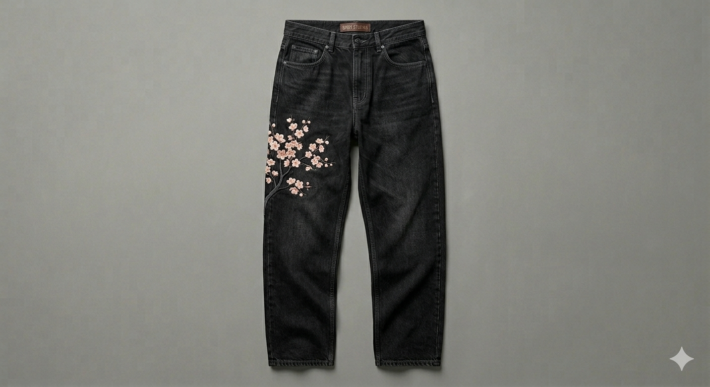 Vaqueros negros con corte baggy recto, diseñados para combinar comodidad y estilo streetwear. Confeccionados en denim de alta calidad con acabado ligeramente lavado, presentan un bordado discreto de un árbol de cerezos en flor en el lateral,